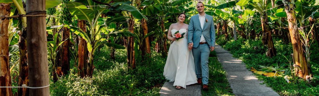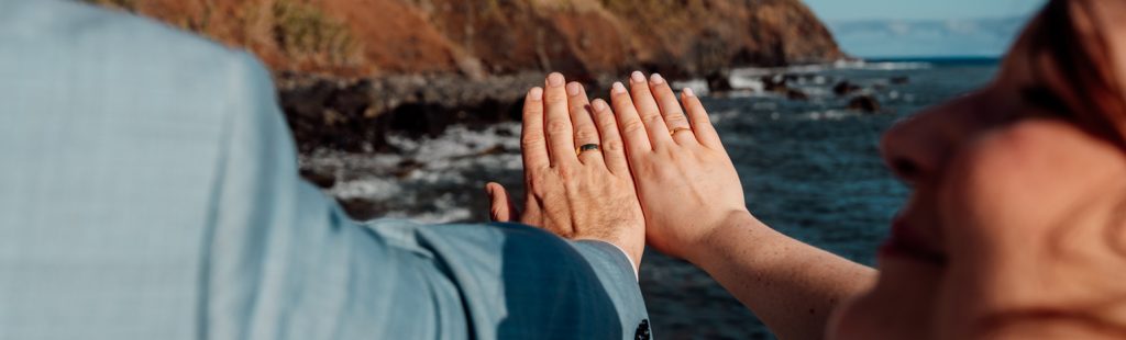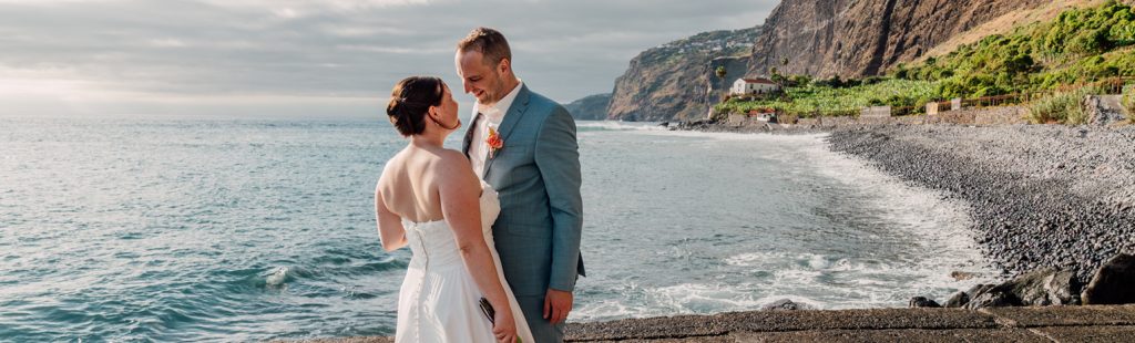 Berit & Joscha schwebten mit einer der steilsten Seilbahnen auf Madeira hinunter zum Fajã. Unten angekommen, ging es zu Fuß durch den Bananenhain zum Traualtar unter freiem Himmel mit Meerblick und das natürlich bei strahlendem Sonnenschein und warmen 25 Grad Celsius.